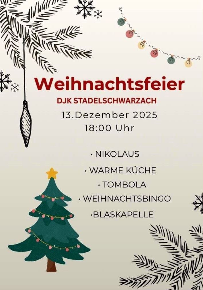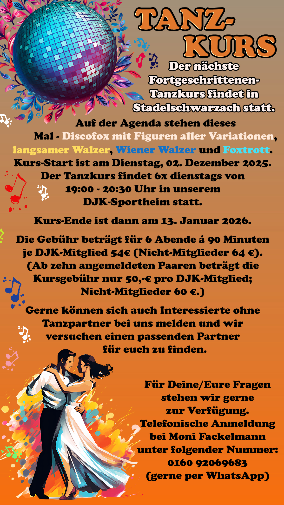 Tanzkurs Der nächste Fortgeschrittenen- Tanzkurs findet in Stadelschwarzach statt. Auf der Agenda stehen dieses Mal - Discofox mit Figuren aller Variationen, langsamer Walzer, Wiener Walzer und Foxtrott. Kurs-Start ist am Dienstag, 02. Dezember 2025. Der Tanzkurs findet 6x dienstags von 19:00 - 20:30 Uhr in unserem DJK-Sportheim statt. Kurs-Ende ist dann am 13. Januar 2026. Die Gebühr beträgt für 6 Abende á 90 Minuten je DJK-Mitglied 54€ (Nicht-Mitglieder 64 €). (Ab zehn angemeldeten Paaren beträgt die Kursgebühr nur 50,-€ pro DJK-Mitglied; Nicht-Mitglieder 60 €.) Gerne können sich auch Interessierte ohne Tanzpartner bei uns melden und wir versuchen einen passenden Partner für [...] |