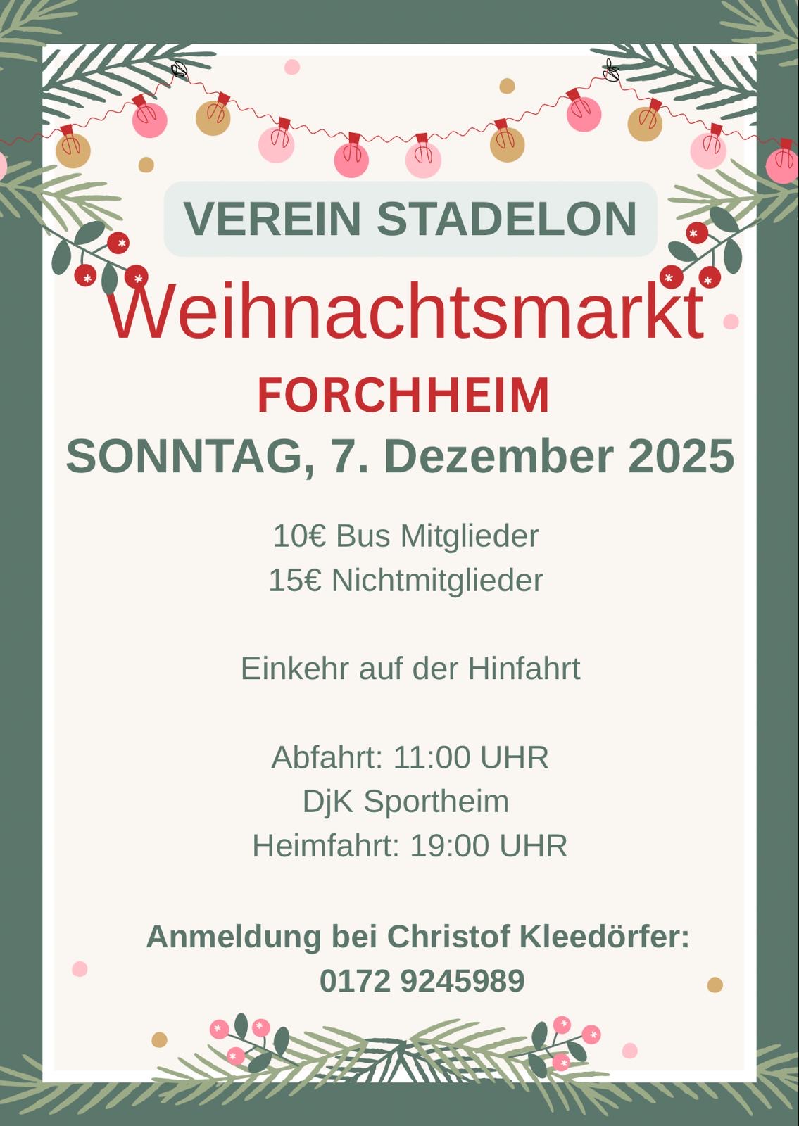 Auch dieses Jahr möchten wir wieder ein paar schöne Stunden mit Euch auf einem Weihnachtsmarkt verbringen. Dieses Jahr heißt das Ziel - Forchheim. Bitte meldet euch zwecks Planung ZEITNAH & VERBINDLICH bei Christof Kleedörfer oder unter verein-stadelon@gmx.de an ☝️ Wir freuen uns auf Euch! Vorstandschaft, Verein Stadelon