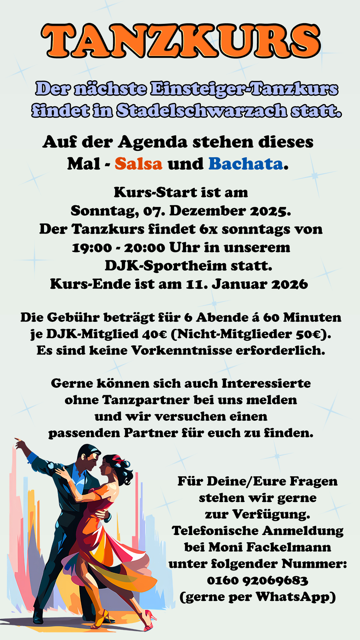 Tanzkurs Der nächste Einsteiger-Tanzkurs findet in Stadelschwarzach statt. Auf der Agenda stehen dieses Mal - Salsa und Bachata. Kurs-Start ist am Sonntag, 07. Dezember 2025. Der Tanzkurs findet 6x sonntags von 19:00 - 20:00 Uhr in unserem DJK-Sportheim statt. Kurs-Ende ist am 11. Januar 2026. Die Gebühr beträgt für 6 Abende á 60 Minuten je DJK-Mitglied 40€ (Nicht-Mitglieder 50€). Es sind keine Vorkenntnisse erforderlich. Gerne können sich auch Interessierte ohne Tanzpartner bei uns melden und wir versuchen einen passenden Partner für euch zu finden. Für Deine/Eure Fragen stehen wir gerne zur Verfügung. Telefonische Anmeldung bei Moni Fackelmann unter folgender Nummer: 0160 [...] |