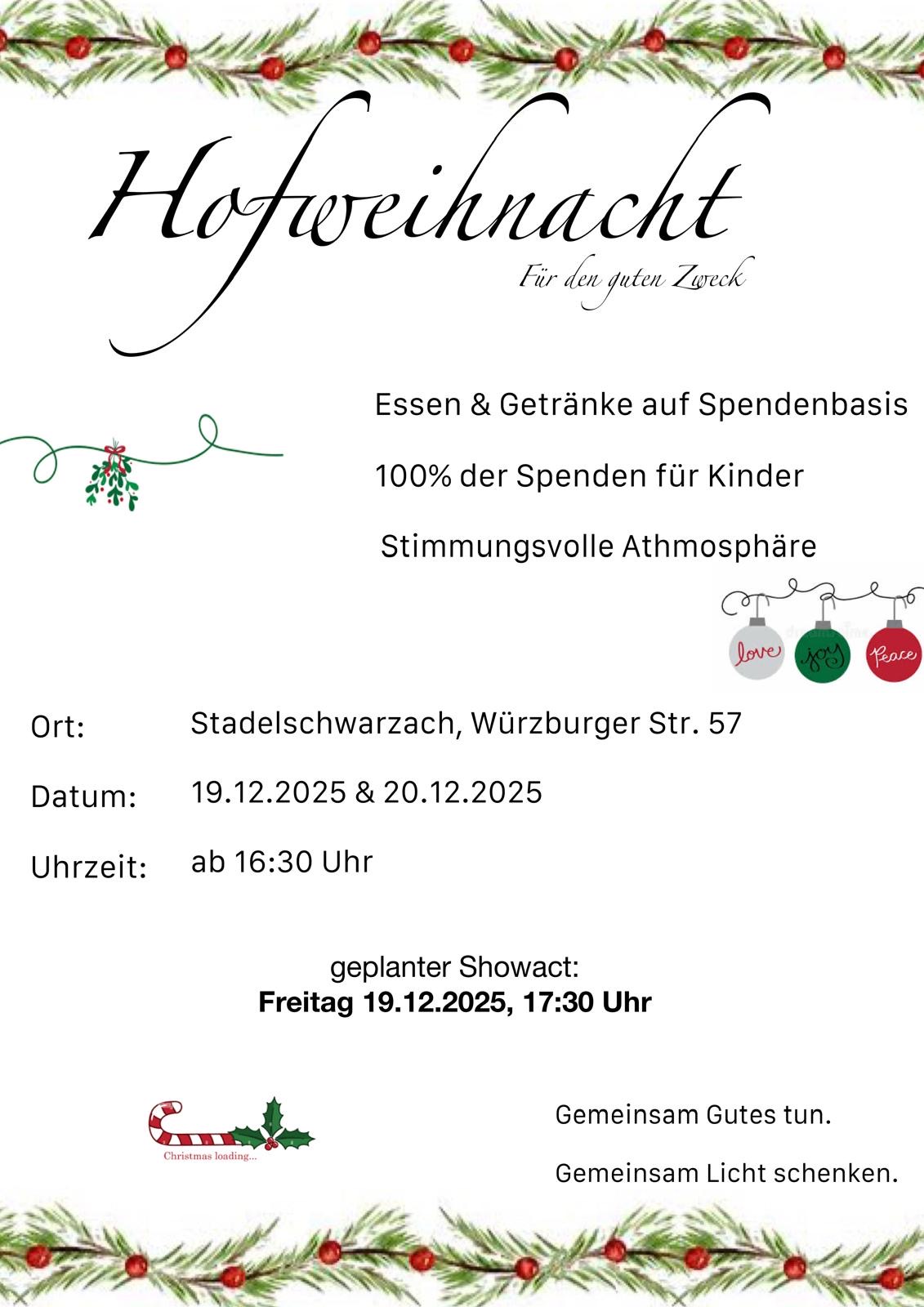 Hofweihnacht - Für den guten Zweck Das bezahlen der Essen & Getränke basiert auf Spendenbasis. 100% der Spenden gehen an Kinder Euch erwartet eine Stimmungsvolle Atmosphäre Der Veranstaltungsort ist in 97357 Stadelschwarzach im Hof in der Würzburger Str. 56. Am Fr. 19.12.2025 & Sa. 20.12.2025 geht es jeweils um 16:30 Uhr los. Wir haben für euch auch einen geplanten Showact. Dieser findet am Freitag, 19.12.2025 um 17:30 Uhr statt. |